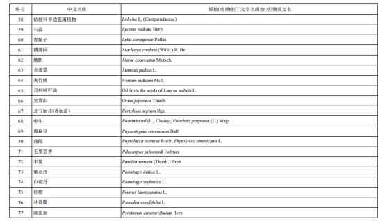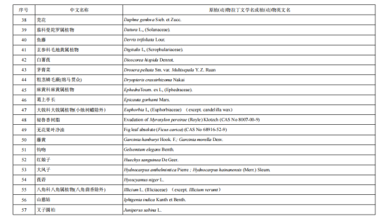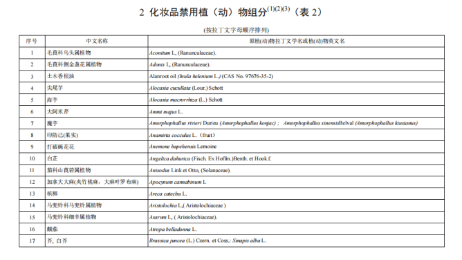 从上述原料要求中,并没有明确哪类植物提取物是不可以加入到抗(抑)菌制剂原料中的,但要求中明确了列入现行有效的《化妆品安全技术规范》(碘除外)的禁用物质不能用于抗(抑)菌制剂的原料,而《化妆品安全技术规范》中有明确的《化妆品禁用植(动)物组分》表,而列于该表中的植物成分就不可以用到抗(抑)菌制剂的原料中,现将组分表分享如下: